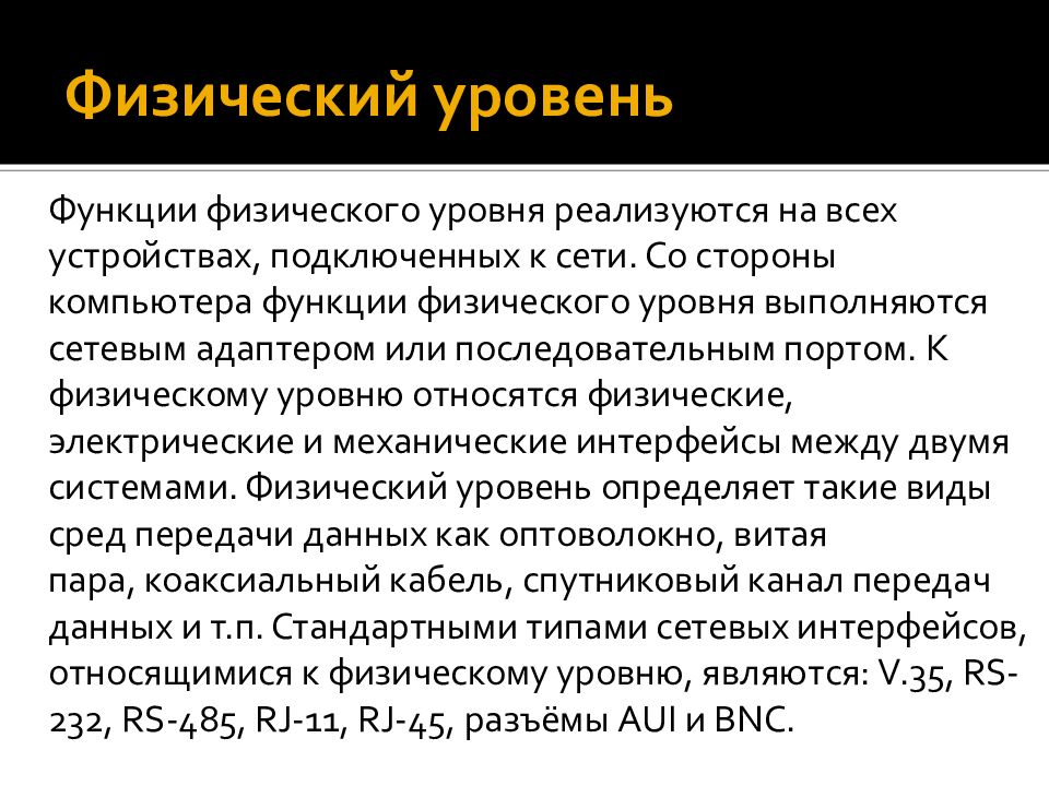 Функции физического уровня реализуются на всех устройствах, подключенных к сети. Со стороны компьютера функции физического уровня выполняются сетевым адаптером или последовательным портом. К физическому уровню относятся физические, электрические и механические интерфейсы между двумя системами. Физический уровень определяет такие виды сред передачи данных как оптоволокно, витая пара, коаксиальный кабель, спутниковый канал передач данных и т.п. Стандартными типами сетевых интерфейсов, относящимися к физическому уровню, являются: V.35, RS-232, RS-485, RJ-11, RJ-45, разъёмы AUI и BNC.