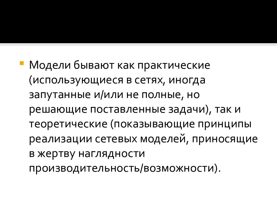 Модели бывают как практические (использующиеся в сетях, иногда запутанные и/или не полные, но решающие поставленные задачи), так и теоретические (показывающие принципы реализации сетевых моделей, приносящие в жертву наглядности производительность/возможности).