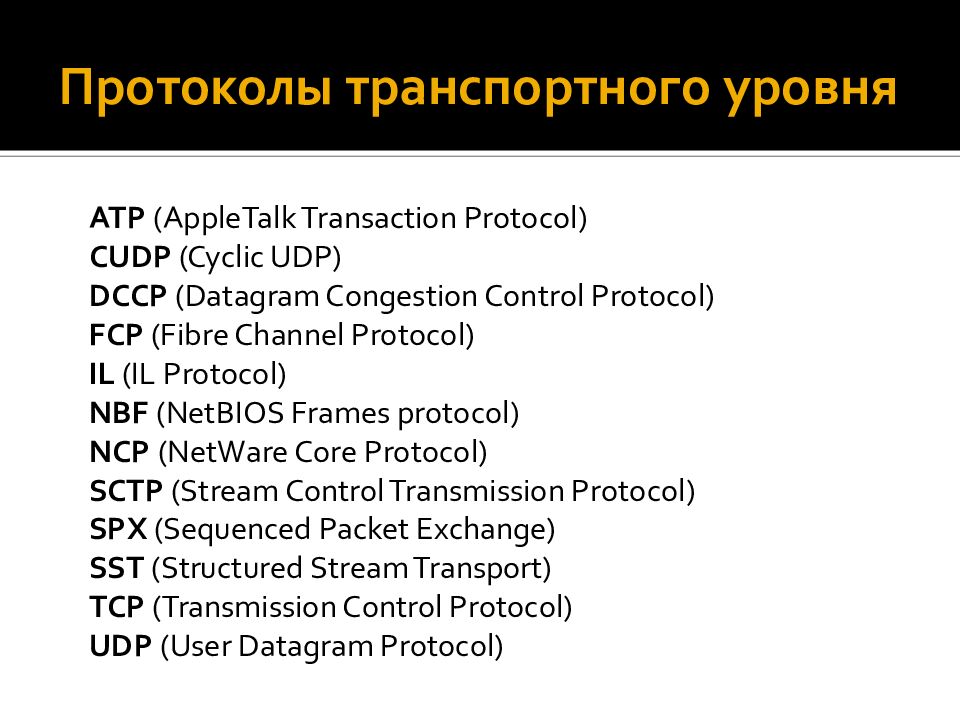 ATP (AppleTalk Transaction Protocol) CUDP (Cyclic UDP) DCCP (Datagram Congestion Control Protocol) FCP ( Fibre Channel Protocol) IL (IL Protocol) NBF (NetBIOS Frames protocol) NCP (NetWare Core Protocol) SCTP (Stream Control Transmission Protocol) SPX (Sequenced Packet Exchange) SST (Structured Stream Transport) TCP (Transmission Control Protocol) UDP (User Datagram Protocol)