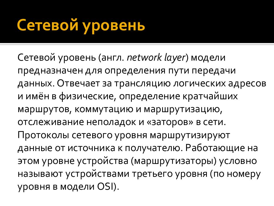 Сетевой уровень (англ. network layer ) модели предназначен для определения пути передачи данных. Отвечает за трансляцию логических адресов и имён в физические, определение кратчайших маршрутов, коммутацию и маршрутизацию, отслеживание неполадок и «заторов» в сети. Протоколы сетевого уровня маршрутизируют данные от источника к получателю. Работающие на этом уровне устройства ( маршрутизаторы ) условно называют устройствами третьего уровня (по номеру уровня в модели OSI).