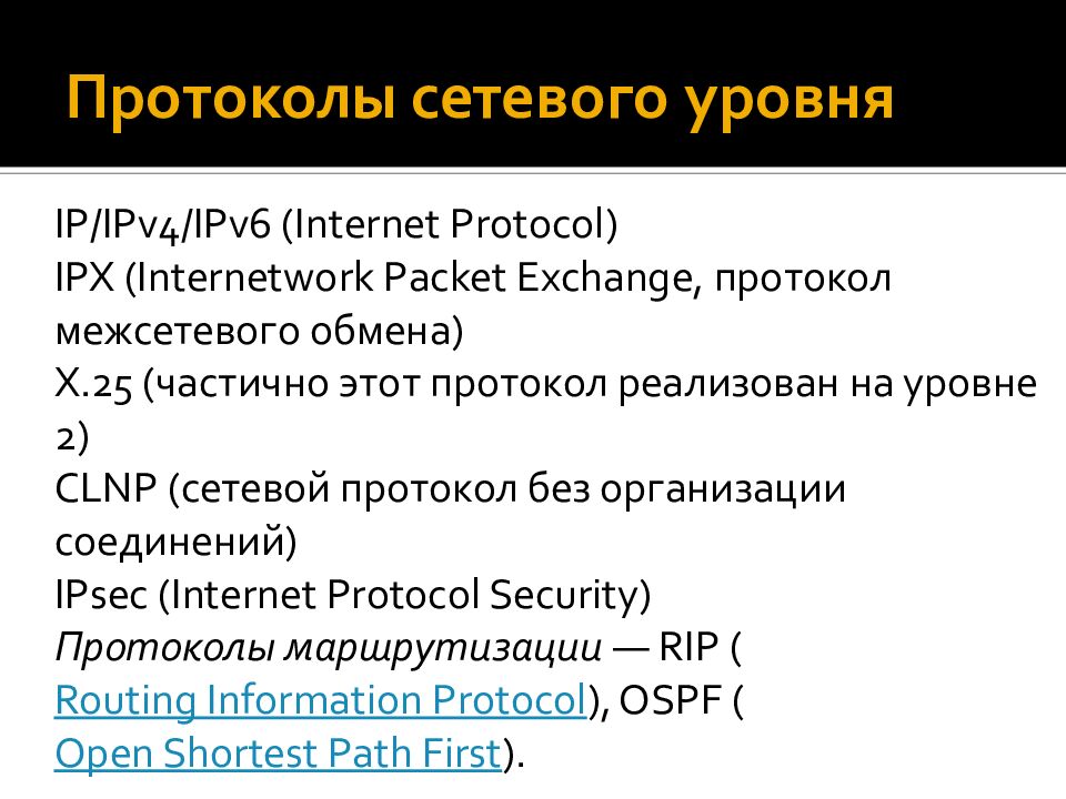 IP/IPv4/IPv6 (Internet Protocol) IPX (Internetwork Packet Exchange, протокол межсетевого обмена) X.25 ( частично этот протокол реализован на уровне 2) CLNP ( сетевой протокол без организации соединений) IPsec (Internet Protocol Security) Протоколы маршрутизации — RIP ( Routing Information Protocol ), OSPF ( Open Shortest Path First ).