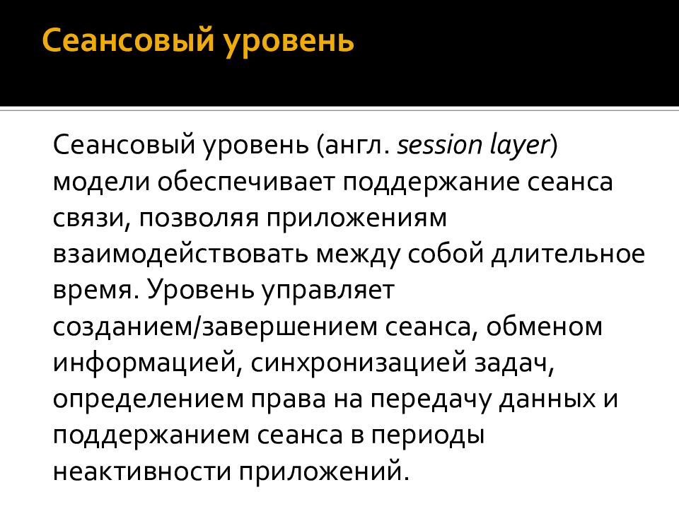 Сеансовый уровень (англ. session layer ) модели обеспечивает поддержание сеанса связи, позволяя приложениям взаимодействовать между собой длительное время. Уровень управляет созданием/завершением сеанса, обменом информацией, синхронизацией задач, определением права на передачу данных и поддержанием сеанса в периоды неактивности приложений.