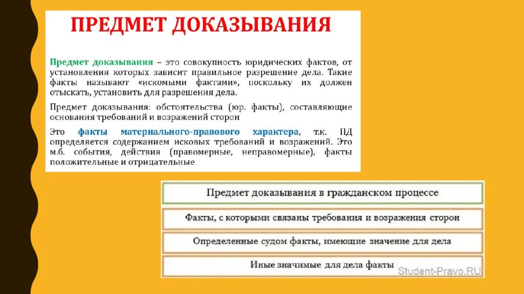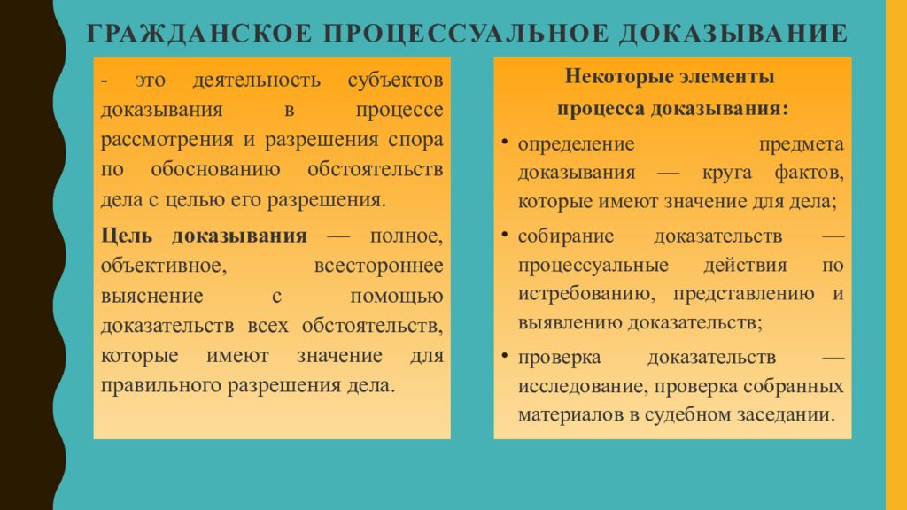 - это деятельность субъектов доказывания в процессе рассмотрения и разрешения спора по обоснованию обстоятельств дела с целью его разрешения. Цель доказывания — полное, объективное, всестороннее выяснение с помощью доказательств всех обстоятельств, которые имеют значение для правильного разрешения дела. Некоторые элементы процесса доказывания: определение предмета доказывания — круга фактов, которые имеют значение для дела; собирание доказательств — процессуальные действия по истребованию, представлению и выявлению доказательств; проверка доказательств — исследование, проверка собранных материалов в судебном заседании.