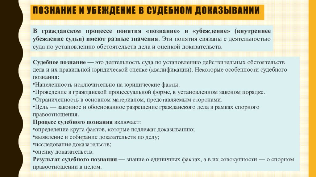 В гражданском процессе понятия «познание» и «убеждение» (внутреннее убеждение судьи) имеют разные значения. Эти понятия связаны с деятельностью суда по установлению обстоятельств дела и оценкой доказательств. Судебное познание — это деятельность суда по установлению действительных обстоятельств дела и их правильной юридической оценке (квалификации). Некоторые особенности судебного познания: Нацеленность исключительно на юридические факты. Проведение в гражданской процессуальной форме, в установленном законом порядке. Ограниченность в основном материалом, представляемым сторонами. Цель — законное и обоснованное разрешение гражданского дела в рамках спорного правоотношения. Процесс судебного познания включает: определение круга фактов, которые подлежат доказыванию; выявление и собирание доказательств по делу; исследование доказательств; оценку доказательств. Результат судебного познания — знание о единичных фактах, а в их совокупности — о спорном правоотношении в целом.