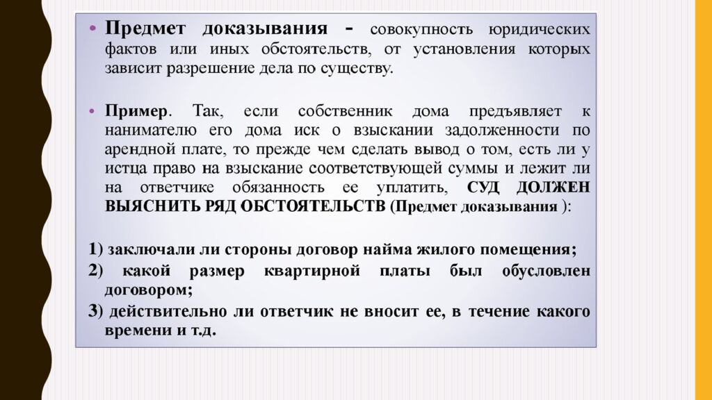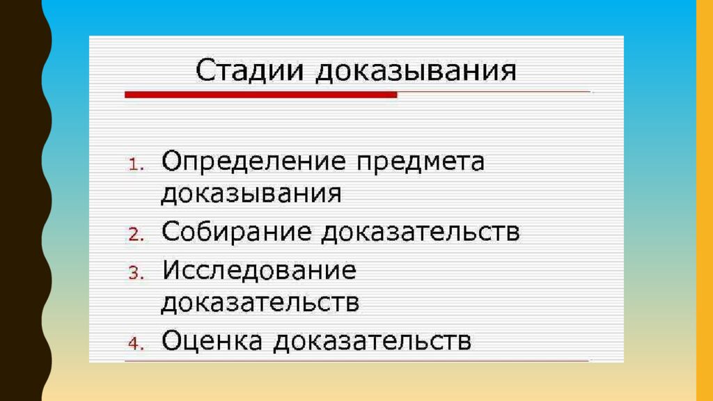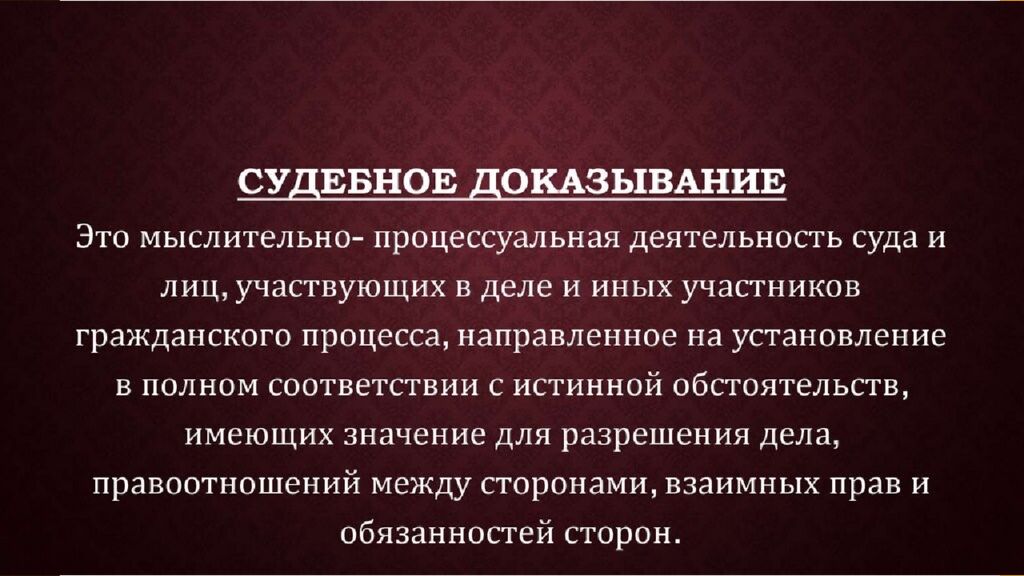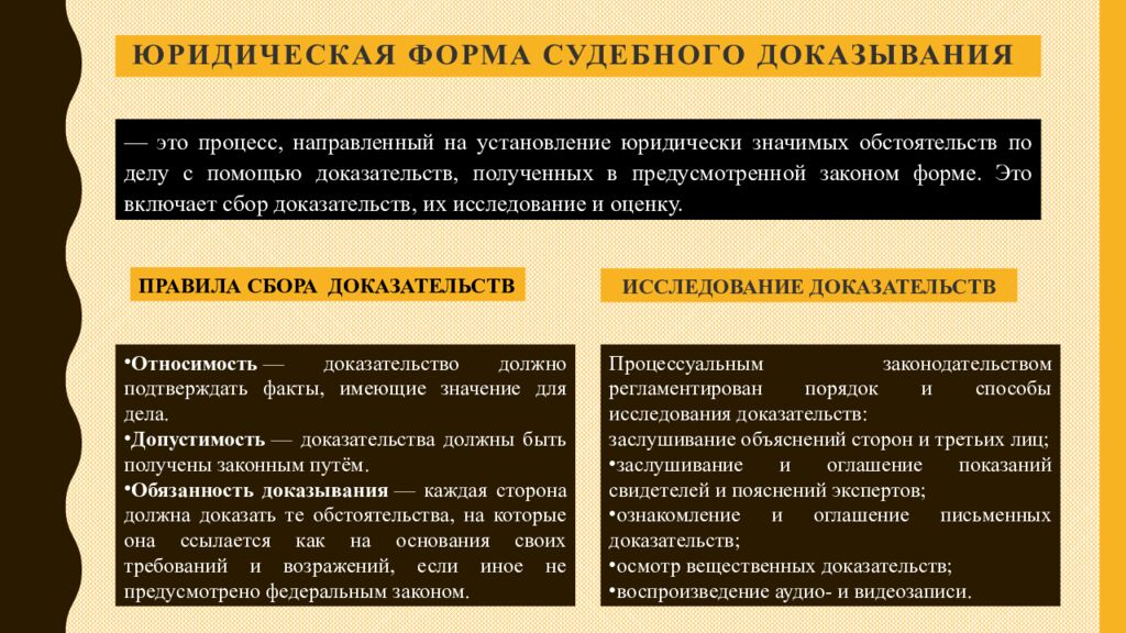 — это процесс, направленный на установление юридически значимых обстоятельств по делу с помощью доказательств, полученных в предусмотренной законом форме. Это включает сбор доказательств, их исследование и оценку. Относимость — доказательство должно подтверждать факты, имеющие значение для дела. Допустимость — доказательства должны быть получены законным путём. Обязанность доказывания — каждая сторона должна доказать те обстоятельства, на которые она ссылается как на основания своих требований и возражений, если иное не предусмотрено федеральным законом. ПРАВИЛА СБОРА ДОКАЗАТЕЛЬСТВ Процессуальным законодательством регламентирован порядок и способы исследования доказательств: заслушивание объяснений сторон и третьих лиц; заслушивание и оглашение показаний свидетелей и пояснений экспертов; ознакомление и оглашение письменных доказательств; осмотр вещественных доказательств; воспроизведение аудио- и видеозаписи. ИССЛЕДОВАНИЕ ДОКАЗАТЕЛЬСТВ