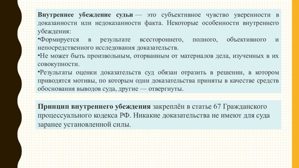 Внутреннее убеждение судьи — это субъективное чувство уверенности в доказанности или недоказанности факта. Некоторые особенности внутреннего убеждения: Формируется в результате всестороннего, полного, объективного и непосредственного исследования доказательств. Не может быть произвольным, оторванным от материалов дела, изученных в их совокупности. Результаты оценки доказательств суд обязан отразить в решении, в котором приводятся мотивы, по которым одни доказательства приняты в качестве средств обоснования выводов суда, другие — отвергнуты. Принцип внутреннего убеждения закреплён в статье 67 Гражданского процессуального кодекса РФ. Никакие доказательства не имеют для суда заранее установленной силы.