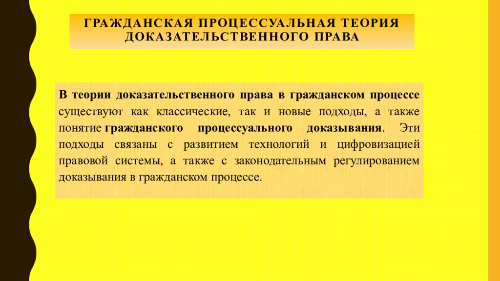В теории доказательственного права в гражданском процессе существуют как классические, так и новые подходы, а также понятие гражданского процессуального доказывания. Эти подходы связаны с развитием технологий и цифровизацией правовой системы, а также с законодательным регулированием доказывания в гражданском процессе.
