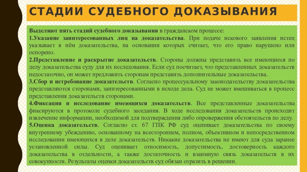 Выделяют пять стадий судебного доказывания в гражданском процессе: Указание заинтересованных лиц на доказательства. При подаче искового заявления истец указывает в нём доказательства, на основании которых считает, что его право нарушено или оспорено. Представление и раскрытие доказательств. Стороны должны представить все имеющиеся по делу доказательства суду для их исследования. Если суд посчитает, что представленных доказательств недостаточно, он может предложить сторонам представить дополнительные доказательства. Сбор и истребование доказательств. Согласно процессуальному законодательству доказательства представляются сторонами, заинтересованными в исходе дела. Суд не может вмешиваться в процесс представления доказательств сторонами. Фиксация и исследование имеющихся доказательств. Все представленные доказательства фиксируются в протоколе судебного заседания. В ходе исследования доказательств происходит извлечение информации, необходимой для подтверждения либо опровержения обстоятельств по делу. Оценка доказательств. Согласно ст. 67 ГПК РФ суд оценивает доказательства по своему внутреннему убеждению, основанному на всестороннем, полном, объективном и непосредственном исследовании имеющихся в деле доказательств. Никакие доказательства не имеют для суда заранее установленной силы. Суд оценивает относимость, допустимость, достоверность каждого доказательства в отдельности, а также достаточность и взаимную связь доказательств в их совокупности. Результаты оценки доказательств суд обязан отразить в решении.