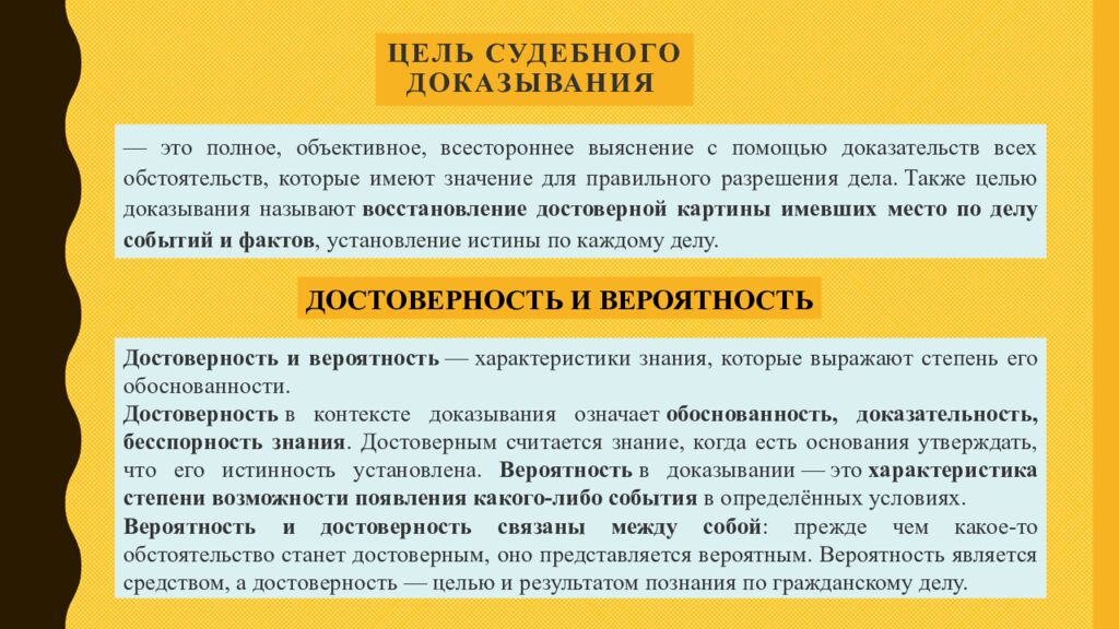 — это полное, объективное, всестороннее выяснение с помощью доказательств всех обстоятельств, которые имеют значение для правильного разрешения дела. Также целью доказывания называют восстановление достоверной картины имевших место по делу событий и фактов, установление истины по каждому делу. Достоверность и вероятность — характеристики знания, которые выражают степень его обоснованности. Достоверность в контексте доказывания означает обоснованность, доказательность, бесспорность знания. Достоверным считается знание, когда есть основания утверждать, что его истинность установлена. Вероятность в доказывании — это характеристика степени возможности появления какого-либо события в определённых условиях. Вероятность и достоверность связаны между собой : прежде чем какое-то обстоятельство станет достоверным, оно представляется вероятным. Вероятность является средством, а достоверность — целью и результатом познания по гражданск ому делу. ДОСТОВЕРНОСТЬ И ВЕРОЯТНОСТЬ