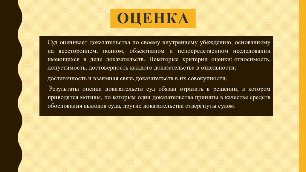 Суд оценивает доказательства по своему внутреннему убеждению, основанному на всестороннем, полном, объективном и непосредственном исследовании имеющихся в деле доказательств. Некоторые критерии оценки: относимость, допустимость, достоверность каждого доказательства в отдельности; достаточность и взаимная связь доказательств в их совокупности. Результаты оценки доказательств суд обязан отразить в решении, в котором приводятся мотивы, по которым одни доказательства приняты в качестве средств обоснования выводов суда, другие доказательства отвергнуты судом.
