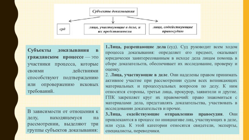 Субъекты доказывания в гражданском процессе — это участники процесса, которые своими действиями способствуют подтверждению или опровержению исковых требований. Лица, разрешающие дела (суд). Суд руководит всем ходом процесса доказывания: определяет его предмет, оказывает юридически заинтересованным в исходе дела лицам помощь в сборе доказательств, обеспечивает их исследование, проверку и оценку. Лица, участвующие в деле. Они наделены правом принимать активное участие при рассмотрении судом всех возникающих материальных и процессуальных вопросов по делу. К ним относятся стороны, третьи лица, прокурор, заявители и другие. ГПК закрепляет круг их правомочий: право знакомиться с материалами дела, представлять доказательства, участвовать в исследовании доказательств и прочее. Лица, содействующие отправлению правосудия. Они привлекаются в процесс по инициативе лиц, участвующих в деле, или суда. К этой категории относятся свидетели, эксперты, специалисты, переводчики. В зависимости от отношения к делу, находящемуся на рассмотрении, выделяют три группы субъектов доказывания:
