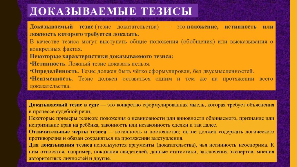 Доказываемый тезис (тезис доказательства) — это положение, истинность или ложность которого требуется доказать. В качестве тезиса могут выступать общие положения (обобщения) или высказывания о конкретных фактах. Некоторые характеристики доказываемого тезиса: Истинность. Ложный тезис доказать нельзя. Определённость. Тезис должен быть чётко сформулирован, без двусмысленностей. Неизменность. Тезис должен оставаться одним и тем же на протяжении всего доказательства. Доказываемый тезис в суде — это конкретно сформулированная мысль, которая требует объяснения в процессе судебной речи. Некоторые примеры тезисов: положения о невиновности или виновности обвиняемого, признание или непризнание прав на ребёнка, законность или незаконность сделки и так далее. Отличительные черты тезиса — логичность и постоянство: он не должен содержать логического противоречия и обязан сохраняться на протяжении выступления. Для доказывания тезиса используются аргументы (доказательства), чья истинность неоспорима. К ним относятся, например, показания свидетелей, данные статистики, заключения экспертов, мнения авторитетных личностей и другие.