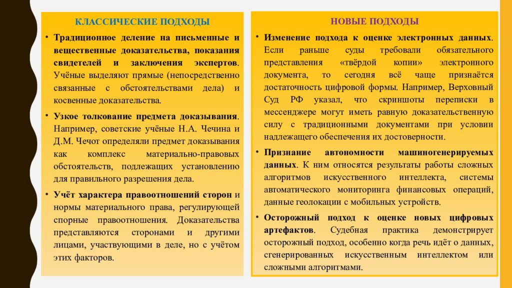КЛАССИЧЕСКИЕ ПОДХОДЫ Традиционное деление на письменные и вещественные доказательства, показания свидетелей и заключения экспертов. Учёные выделяют прямые (непосредственно связанные с обстоятельствами дела) и косвенные доказательства. Узкое толкование предмета доказывания. Например, советские учёные Н.А. Чечина и Д.М. Чечот определяли предмет доказывания как комплекс материально-правовых обстоятельств, подлежащих установлению для правильного разрешения дела. Учёт характера правоотношений сторон и нормы материального права, регулирующей спорные правоотношения. Доказательства представляются сторонами и другими лицами, участвующими в деле, но с учётом этих факторов. НОВЫЕ ПОДХОДЫ Изменение подхода к оценке электронных данных. Если раньше суды требовали обязательного представления «твёрдой копии» электронного документа, то сегодня всё чаще признаётся достаточность цифровой формы. Например, Верховный Суд РФ указал, что скриншоты переписки в мессенджере могут иметь равную доказательственную силу с традиционными документами при условии надлежащего обеспечения их достоверности. Признание автономности машиногенерируемых данных. К ним относятся результаты работы сложных алгоритмов искусственного интеллекта, системы автоматического мониторинга финансовых операций, данные геолокации с мобильных устройств. Осторожный подход к оценке новых цифровых артефактов. Судебная практика демонстрирует осторожный подход, особенно когда речь идёт о данных, сгенерированных искусственным интеллектом или сложными алгоритмами.