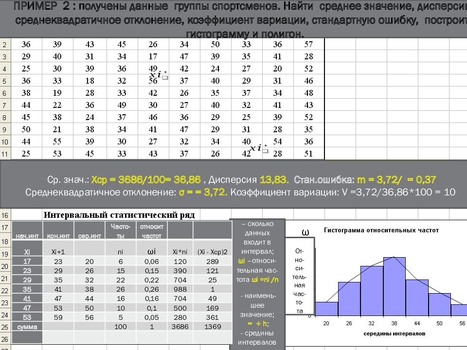 – сколько данных входит в интервал; ωi –относи-тельная час- тота ωi = ni /n - наимень - шее значение; = + h ; - c редины интервалов ω От- но- си- тель - ная час-то- та ПРИМЕР 2 : получены данные группы спортсменов. Найти среднее значение, дисперсию, среднеквадратичное отклонение, коэффициент вариации, стандартную ошибку, построить гистограмму и полигон. нач.инт кон.инт cер.инт Часто-ты относитчастот Хi Xi+1 ni ωi Xi*ni ( Хi - Хср )2 17 23 20 6 0,06 120 289 23 29 26 15 0,15 390 121 29 35 32 22 0,22 704 25 35 41 38 26 0,26 988 1 41 47 44 16 0,16 704 49 47 53 50 10 0,1 500 169 53 59 56 5 0,05 280 361 сумма 100 1 3686 1369 нач.инт кон.инт cер.инт Часто-ты относитчастот Хi Xi+1 ni ωi Xi*ni ( Хi - Хср )2 17 23 20 6 0,06 120 289 23 29 26 15 0,15 390 121 29 35 32 22 0,22 704 25 35 41 38 26 0,26 988 1 41 47 44 16 0,16 704 49 47 53 50 10 0,1 500 169 53 59 56 5 0,05 280 361 сумма 100 1 3686 1369 Ср. знач.: Хср = 3686/100= 36,86, Дисперсия 13,83. Стан.ошибка : m = 3,72/ = 0,37 Среднеквадратичное отклонение: σ = = 3,72. Коэффициент вариации: V =3,72/36,86*100 = 10