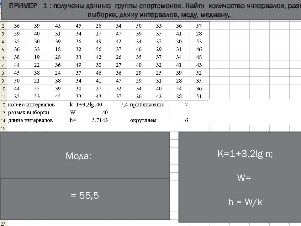 Xi*ni 120 390 704 988 704 500 280 3686 K=1+3, 2lg n ; W= h = W /k ПРИМЕР 1 : получены данные группы спортсменов. Найти количество интервалов, размах выборки, длину интервалов, моду, медиану,. Мода: = 55,5