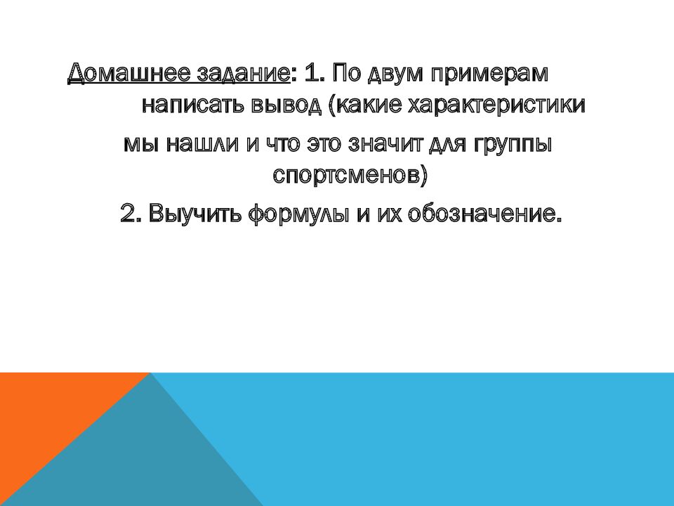 Домашнее задание : 1. По двум примерам написать вывод (какие характеристики мы нашли и что это значит для группы спортсменов) 2. Выучить формулы и их обозначение.