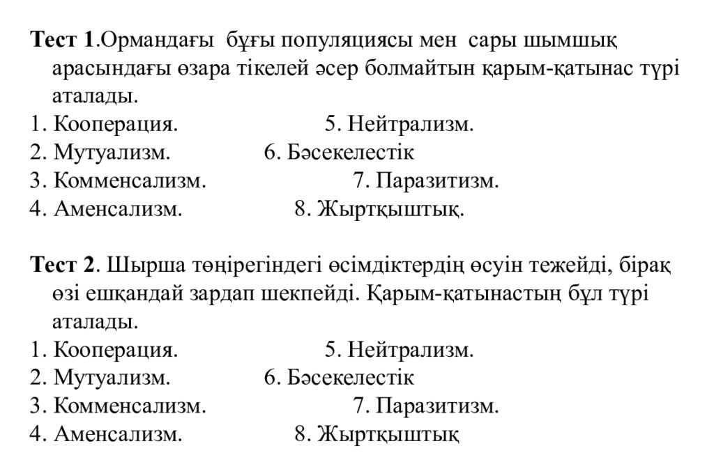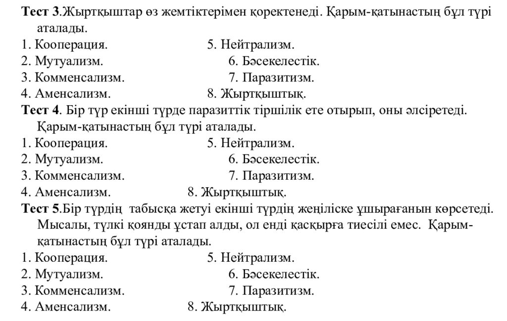 Тест 1.Ормандағы бұғы популяциясы мен сары шымшық арасындағы өзара тікелей әсер болмайтын қарым-қатынас түрі аталады. 1. Кооперация. 5. Нейтрализм. 2. Мутуализм. 6. Бәсекелестік 3. Комменсализм. 7. Паразитизм. 4. Аменсализм. 8. Жыртқыштық. Тест 2. Шырша төңірегіндегі өсімдіктердің өсуін тежейді, бірақ өзі ешқандай зардап шекпейді. Қарым-қатынастың бұл түрі аталады. 1. Кооперация. 5. Нейтрализм. 2. Мутуализм. 6. Бәсекелестік 3. Комменсализм. 7. Паразитизм. 4. Аменсализм. 8. Жыртқыштық