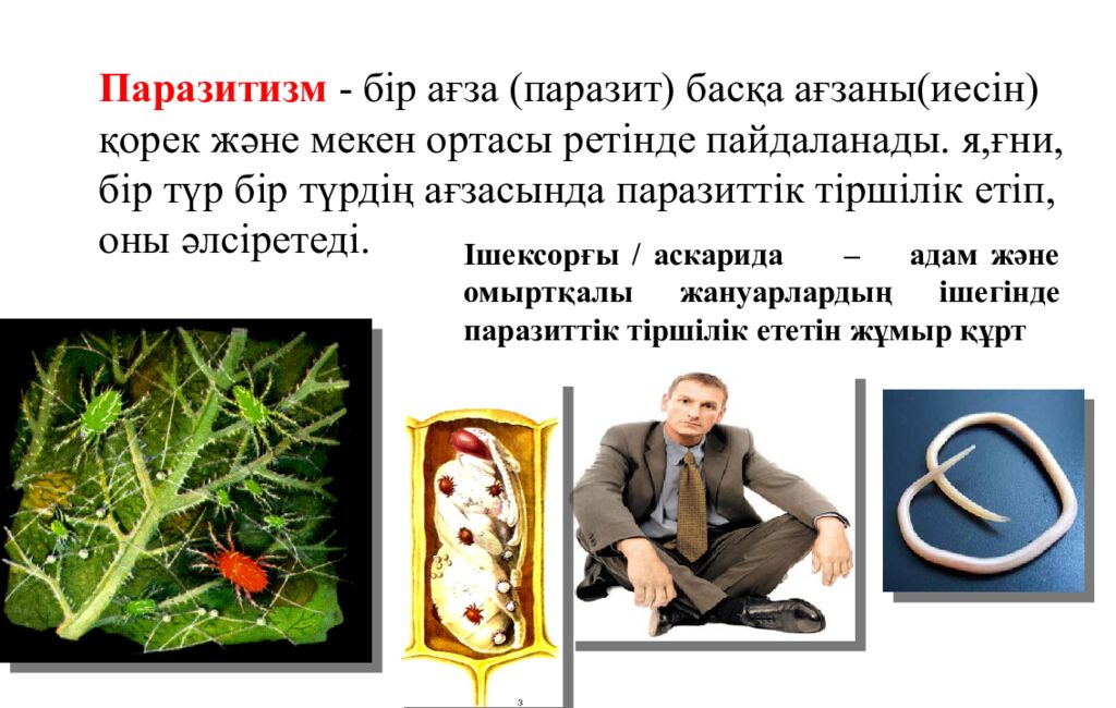 Паразитизм - бір ағза (паразит) басқа ағзаны ( иесін ) қорек және мекен ортасы ретінде пайдаланады. я,ғни, бір түр бір түрдің ағзасында паразиттік тіршілік етіп, оны әлсіретеді. Ішексорғы / аскарида – адам және омыртқалы жануарлардың ішегінде паразиттік тіршілік ететін жұмыр құрт