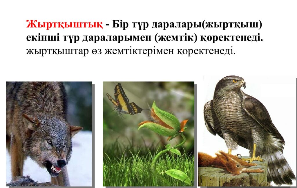 Жыртқыштық - Бір түр даралары ( жыртқыш ) екінші түр дараларымен ( жемтік ) қоректенеді. жыртқыштар өз жемтіктерімен қоректенеді.