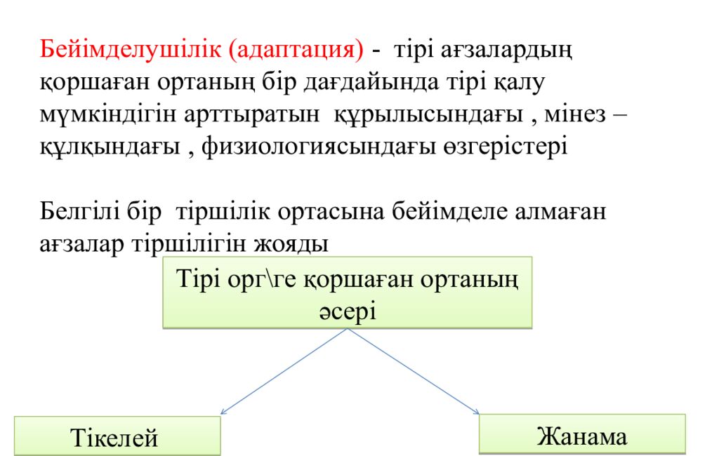 Бейімделушілік (адаптация) - тірі ағзалардың қоршаған ортаның бір дағдайында тірі қалу мүмкіндігін арттыратын құрылысындағы, мінез – құлқындағы, физиологиясындағы өзгерістері Белгілі бір тіршілік ортасына бейімделе алмаған ағзалар тіршілігін жояды Тірі орг\ге қоршаған ортаның әсері Тікелей Жанама