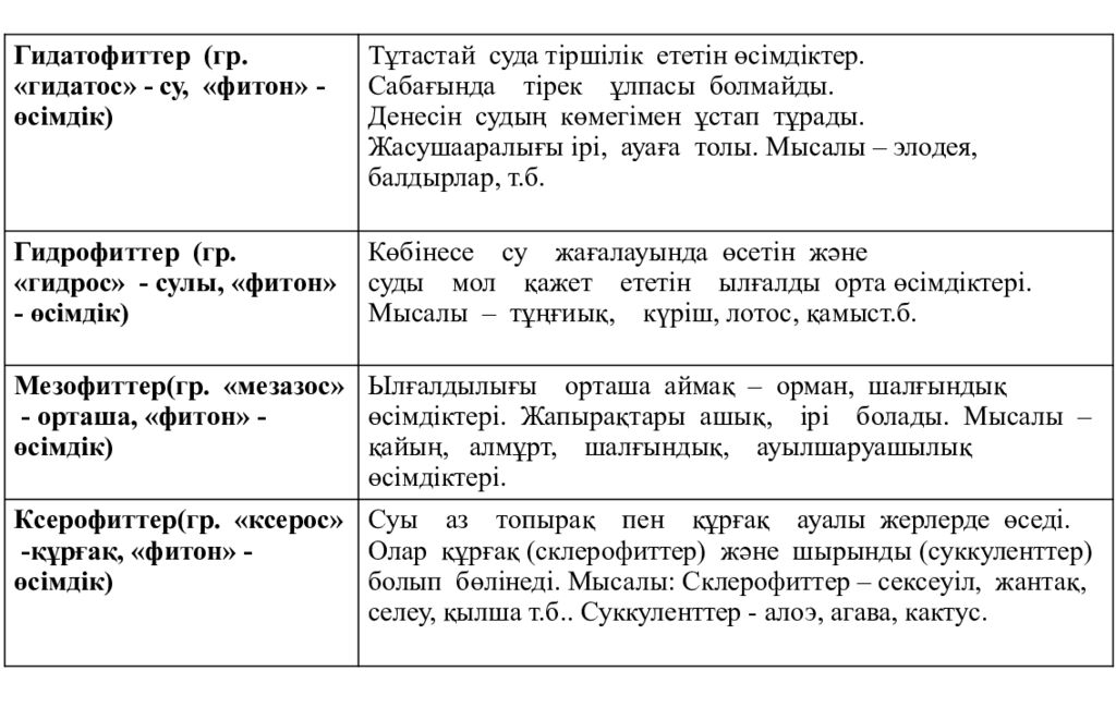 Гидатофиттер (гр. « гидатос » - су, « фитон » - өсімдік ) Тұтастай суда тіршілік ететін өсімдіктер. Сабағында тірек ұлпасы болмайды. Денесін судың көмегімен ұстап тұрады. Жасушааралығы ірі, ауаға толы. Мысалы – элодея, балдырлар, т.б. Гидрофиттер (гр. « гидрос » - сулы, « фитон » - өсімдік ) Көбінесе су жағалауында өсетін және суды мол қажет ететін ылғалды орта өсімдіктері. Мысалы – тұңғиық, күріш, лотос, қамыст.б. Мезофиттер (гр. « мезазос » - орташа, « фитон » - өсімдік ) Ылғалдылығы орташа аймақ – орман, шалғындық өсімдіктері. Жапырақтары ашық, ірі болады. Мысалы – қайың, алмұрт, шалғындық, ауылшаруашылық өсімдіктері. Ксерофиттер (гр. « ксерос » - құрғақ, « фитон » - өсімдік ) Суы аз топырақ пен құрғақ ауалы жерлерде өседі. Олар құрғақ ( склерофиттер ) және шырынды ( суккуленттер ) болып бөлінеді. Мысалы : Склерофиттер – сексеуіл, жантақ, селеу, қылша т.б.. Суккуленттер - алоэ, агава, кактус.