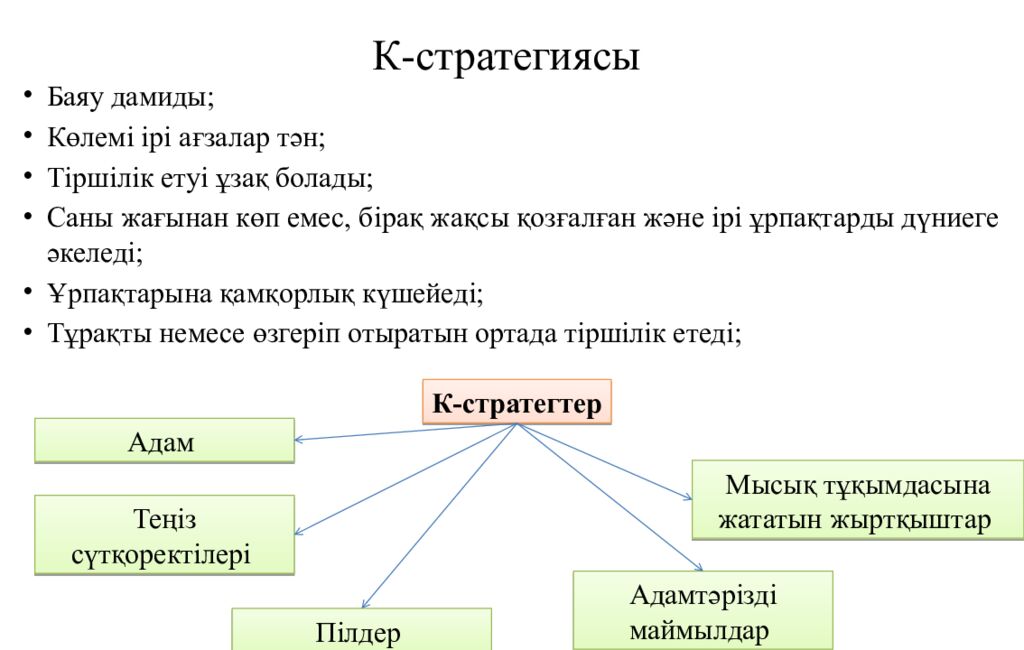 Баяу дамиды ; Көлемі ірі ағзалар тән; Тіршілік етуі ұзақ болады ; Саны жағынан көп емес, бірақ жақсы қозғалған және ірі ұрпақтарды дүниеге әкеледі ; Ұрпақтарына қамқорлық күшейеді; Тұрақты немесе өзгеріп отыратын ортада тіршілік етеді ; К- стратегтер Теңіз сүтқоректілері Адамтәрізді маймылдар Пілдер Мысық тұқымдасына жататын жыртқыштар Адам