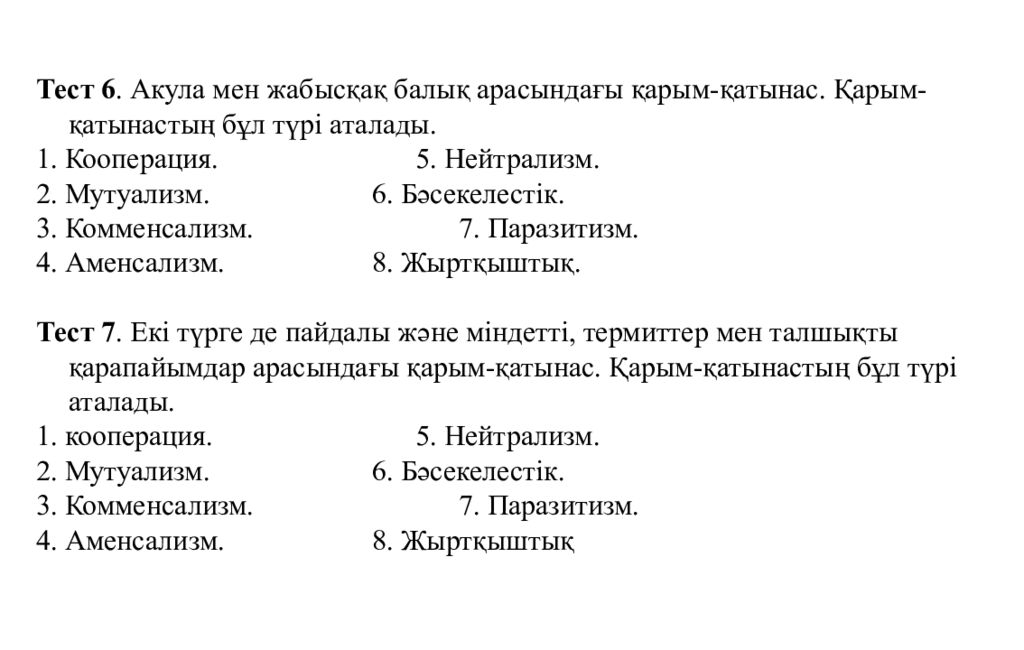 Тест 6. Акула мен жабысқақ балық арасындағы қарым-қатынас. Қарым-қатынастың бұл түрі аталады. 1. Кооперация. 5. Нейтрализм. 2. Мутуализм. 6. Бәсекелестік. 3. Комменсализм. 7. Паразитизм. 4. Аменсализм. 8. Жыртқыштық. Тест 7. Екі түрге де пайдалы және міндетті, термиттер мен талшықты қарапайымдар арасындағы қарым-қатынас. Қарым-қатынастың бұл түрі аталады. 1. кооперация. 5. Нейтрализм. 2. Мутуализм. 6. Бәсекелестік. 3. Комменсализм. 7. Паразитизм. 4. Аменсализм. 8. Жыртқыштық