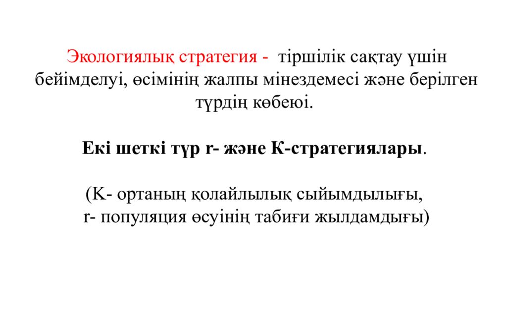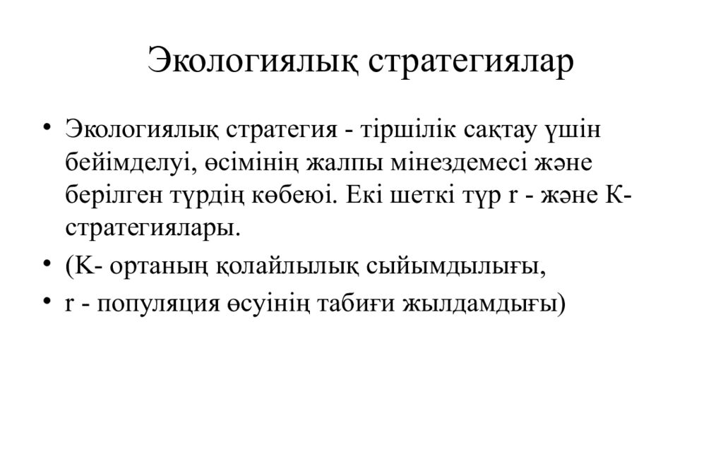 Экологиялық стратегия - тіршілік сақтау үшін бейімделуі, өсімінің жалпы мінездемесі және берілген түрдің көбеюі. Екі шеткі түр r - және К- стратегиялары. ( K- ортаның қолайлылық сыйымдылығы, r - популяция өсуінің табиғи жылдамдығы )