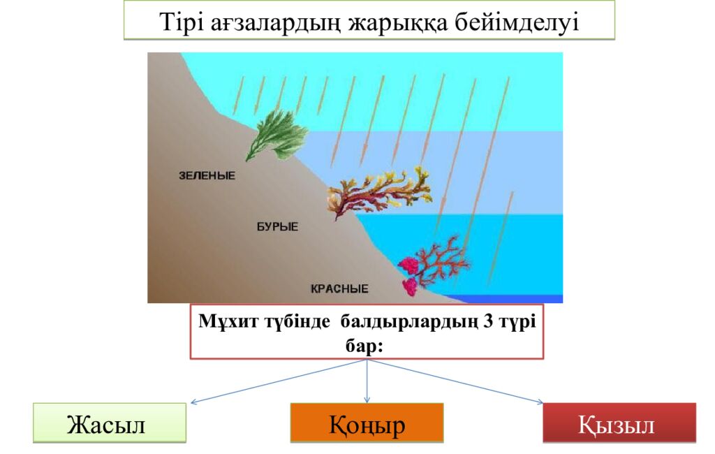 Мұхит түбінде балдырлардың 3 түрі бар: Жасыл Қоңыр Қызыл Тірі ағзалардың жарыққа бейімделуі
