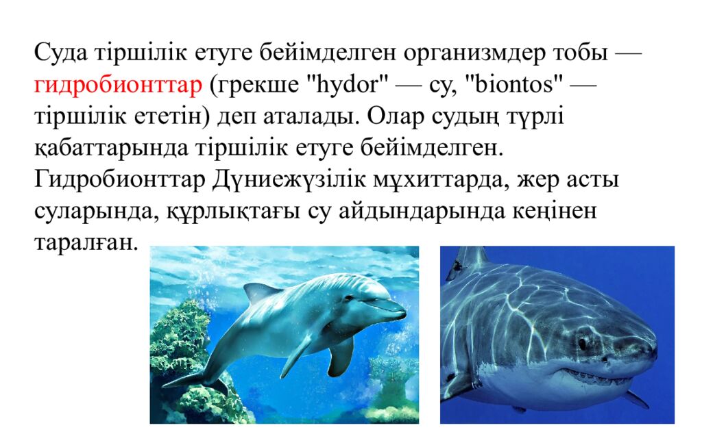 Суда тіршілік етуге бейімделген организмдер тобы — гидробионттар ( грекше " hydor " — су, " biontos " — тіршілік ететін ) деп аталады. Олар судың түрлі қабаттарында тіршілік етуге бейімделген. Гидробионттар Дүниежүзілік мұхиттарда, жер асты суларында, құрлықтағы су айдындарында кеңінен таралған.