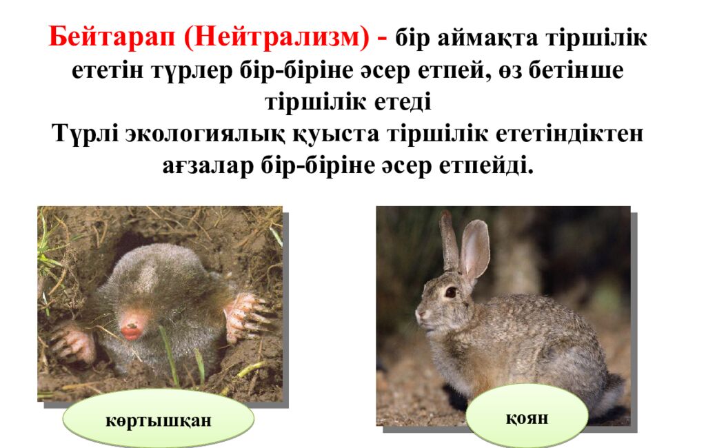 Бейтарап ( Нейтрализм) - б ір аймақта тіршілік ететін түрлер бір-біріне әсер етпей, өз бетінше тіршілік етеді Түрлі экологиялық қуыста тіршілік ететіндіктен ағзалар бір-біріне әсер етпейді. қоян көртышқан