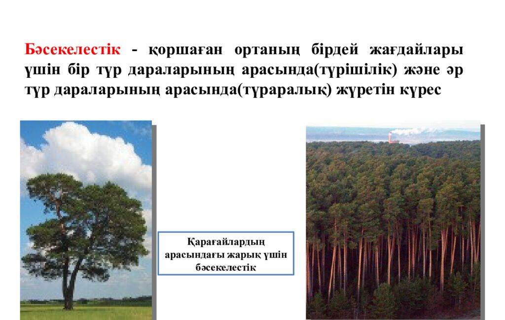 Бәсекелестік - қ оршаған ортаның бірдей жағдайлары үшін бір түр дараларының арасында ( түрішілік ) және әр түр дараларының арасында ( түраралық ) жүретін күрес Қарағайлардың арасындағы жарық үшін бәсекелестік