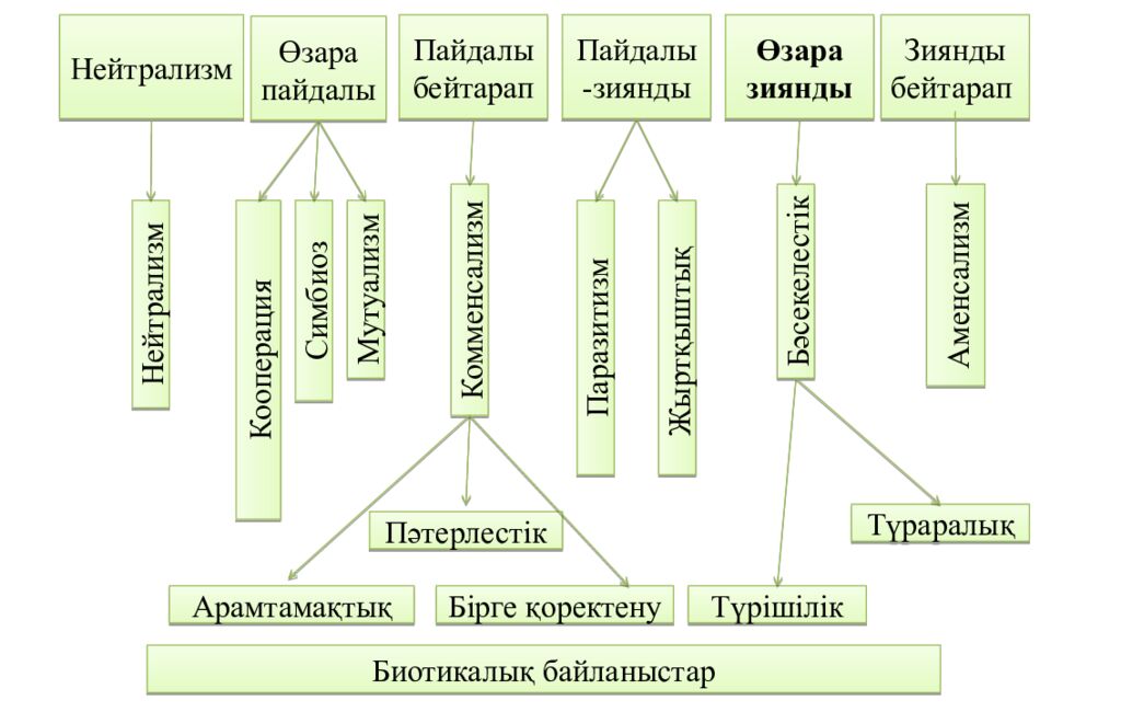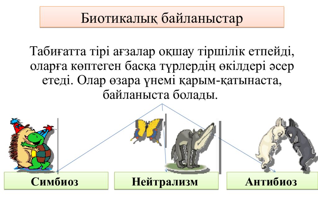 Табиғатта тірі ағзалар оқшау тіршілік етпейді, оларға көптеген басқа түрлердің өкілдері әсер етеді. Олар өзара үнемі қарым-қатынаста, байланыста болады. Биотикалық байланыстар Симбиоз Нейтрализм Антибиоз