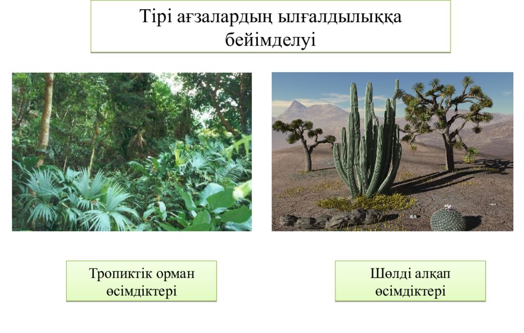 Тірі ағзалардың ылғалдылыққа бейімделуі Шөлді алқап өсімдіктері Тропиктік орман өсімдіктері