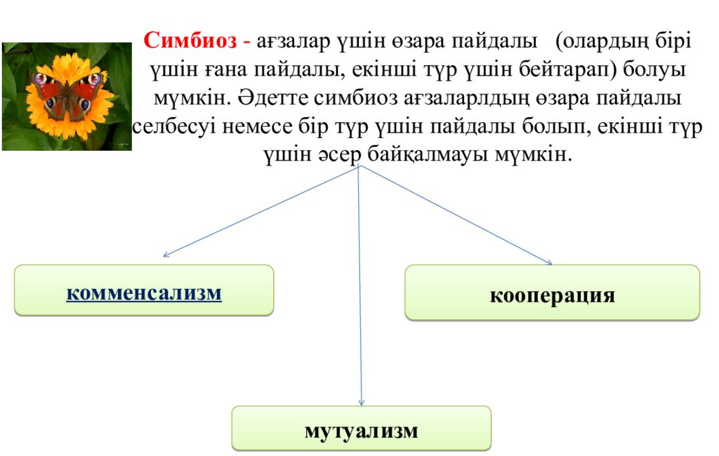 Симбиоз - ағзалар үшін өзара пайдалы ( олардың бірі үшін ғана пайдалы, екінші түр үшін бейтарап ) болуы мүмкін. Әдетте симбиоз ағзаларлдың өзара пайдалы селбесуі немесе бір түр үшін пайдалы болып, екінші түр үшін әсер байқалмауы мүмкін. комменсализм кооперация мутуализм