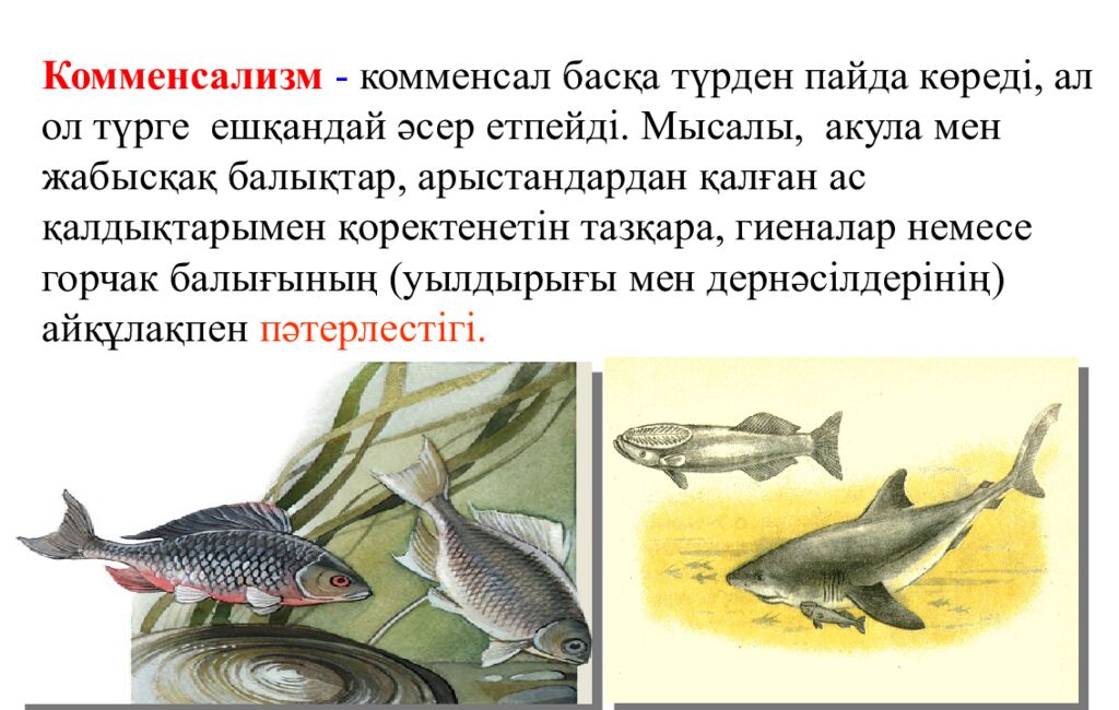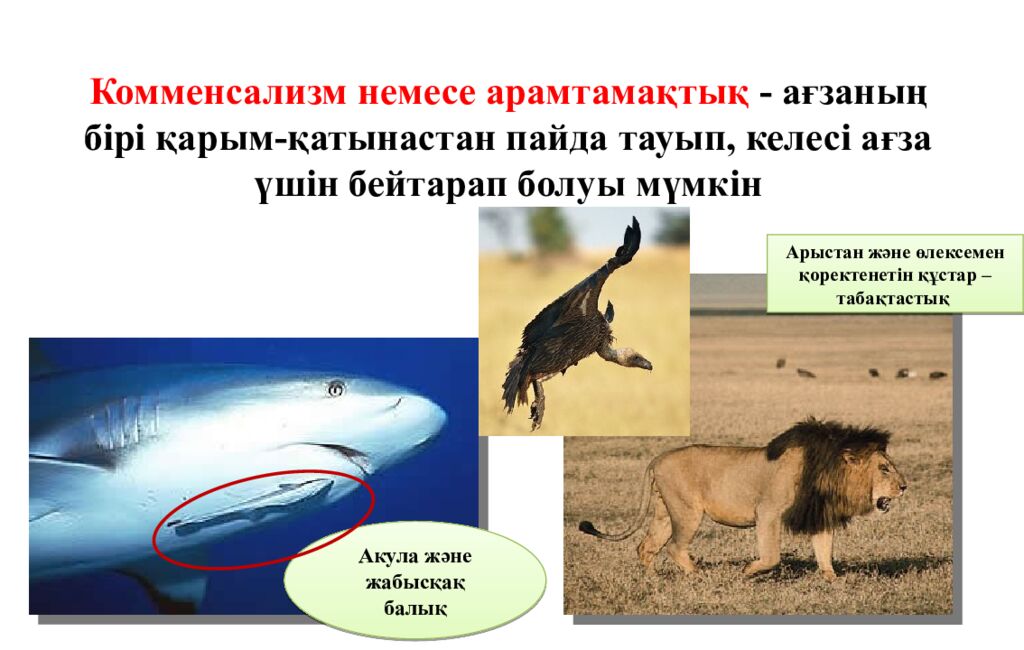 Комменсализм немесе арамтамақтық - ағзаның бірі қарым-қатынастан пайда тауып, келесі ағза үшін бейтарап болуы мүмкін Акула және жабысқақ балық Арыстан және өлексемен қоректенетін құстар – табақтастық
