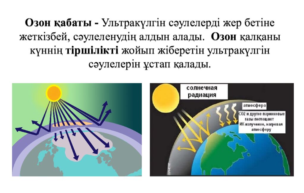 Озон қабаты - Ультракүлгін сәулелерді жер бетіне жеткізбей, сәулеленудің алдын алады. Озон қалқаны күннің тіршілікті жойып жіберетін ультракүлгін сәулелерін ұстап қалады.