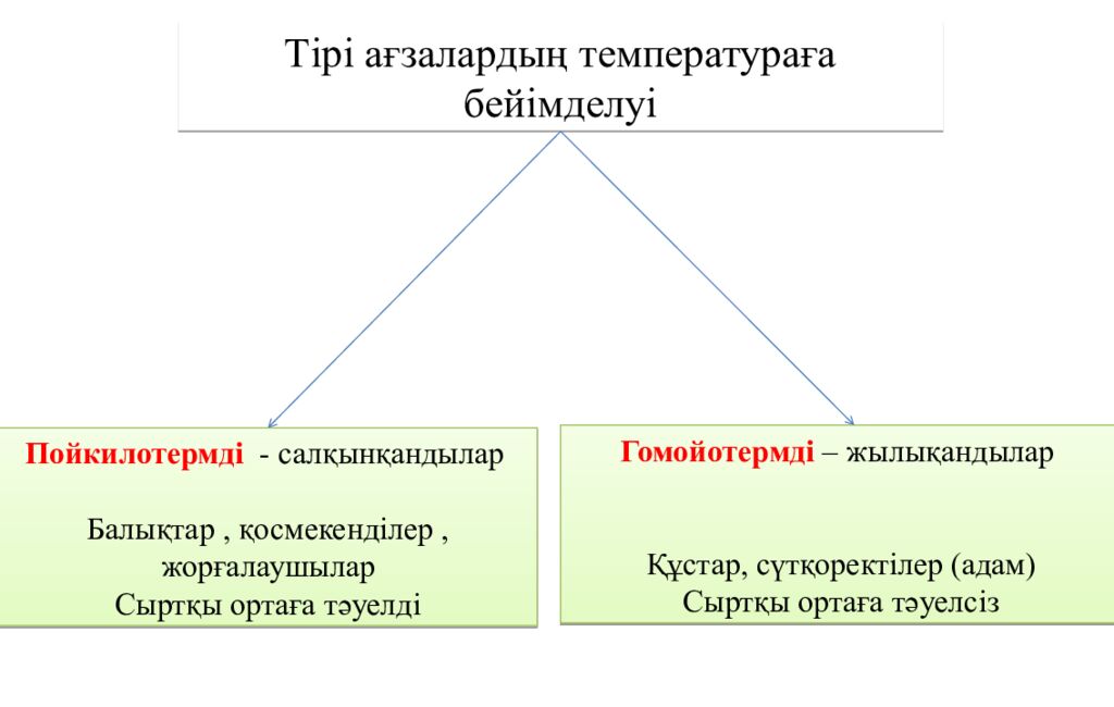 Тірі ағзалардың температураға бейімделуі Пойкилотермді - салқынқандылар Балықтар, қосмекенділер, жорғалаушылар Сыртқы ортаға тәуелді Гомойотермді – жылықандылар Құстар, сүтқоректілер (адам) Сыртқы ортаға тәуелсіз