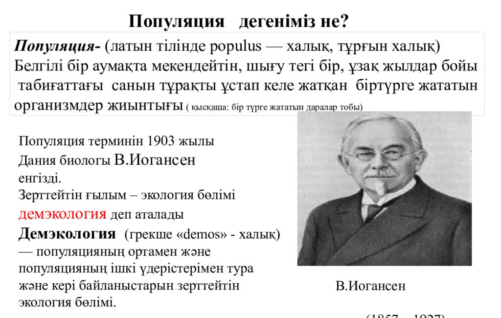 Популяция- (латын тілінде populus — халық, тұрғын халық) Белгілі бір аумақта мекендейтін, шығу тегі бір, ұзақ жылдар бойы табиғаттағы санын тұрақты ұстап келе жатқан біртүрге жататын организмдер жиынтығы ( қысқаша : бір түрге жататын даралар тобы ) Популяция терминін 1903 жылы Дания биологы В.Иогансен енгізді. Зерттейтін ғылым – экология бөлімі демэкология деп аталады Демэкология ( грекше « demos» - халық ) — популяцияның ортамен және популяцияның ішкі үдерістерімен тура және кері байланыстарын зерттейтін экология бөлімі. В.Иогансен (1857 – 1927)