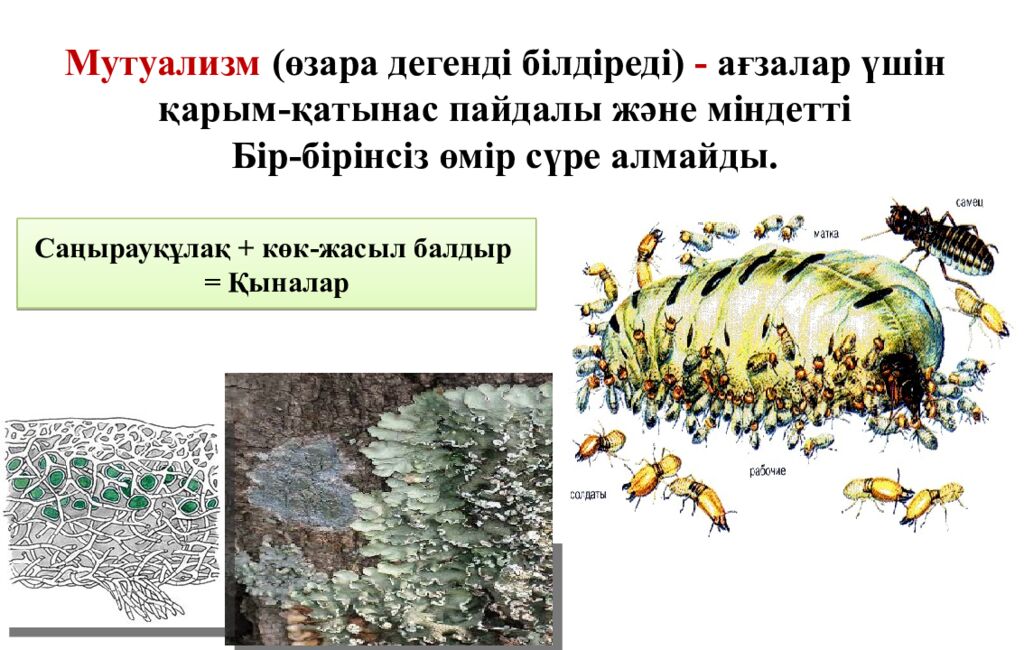 Мутуализм ( өзара дегенді білдіреді ) - ағзалар үшін қарым-қатынас пайдалы және міндетті Бір-бірінсіз өмір сүре алмайды. Саңырауқұлақ + көк-жасыл балдыр = Қыналар