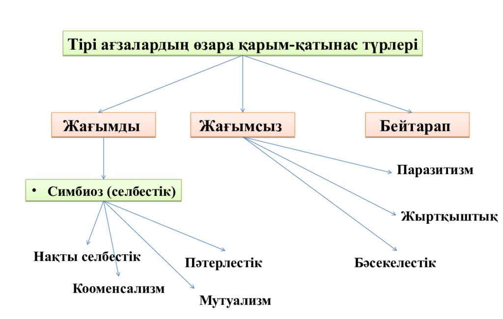 Тірі ағзалардың өзара қарым-қатынас түрлері Жағымды Жағымсыз Бейтарап Симбиоз (селбестік) Нақты селбестік Мутуализм Кооменсализм Пәтерлестік Жыртқыштық Паразитизм Бәсекелестік