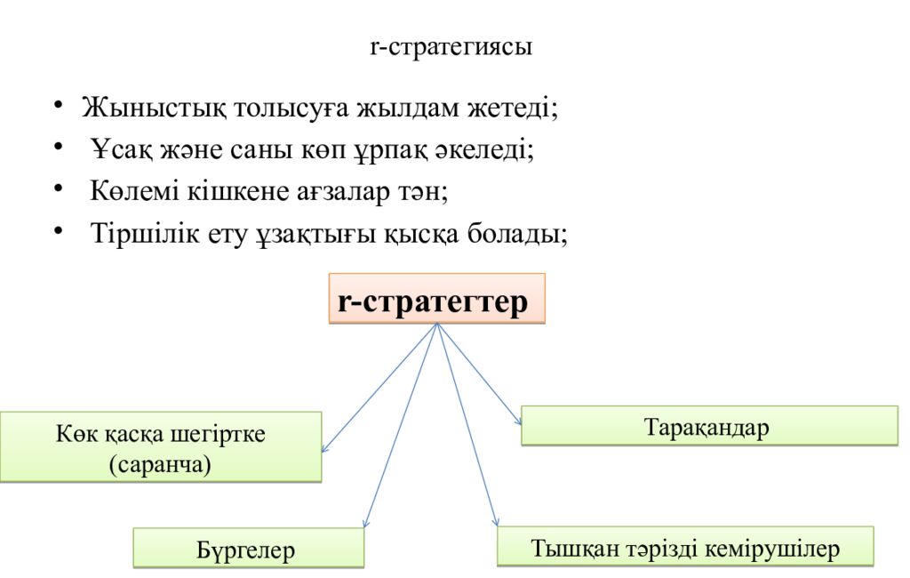 Жыныстық толысуға жылдам жетеді ; Ұсақ және саны көп ұрпақ әкеледі ; Көлемі кішкене ағзалар тән ; Тіршілік ету ұзақтығы қысқа болады ; Көк қасқа шегіртке (саранча ) Бүргелер Тарақандар Тышқан тәрізді кемірушілер r- стратегтер