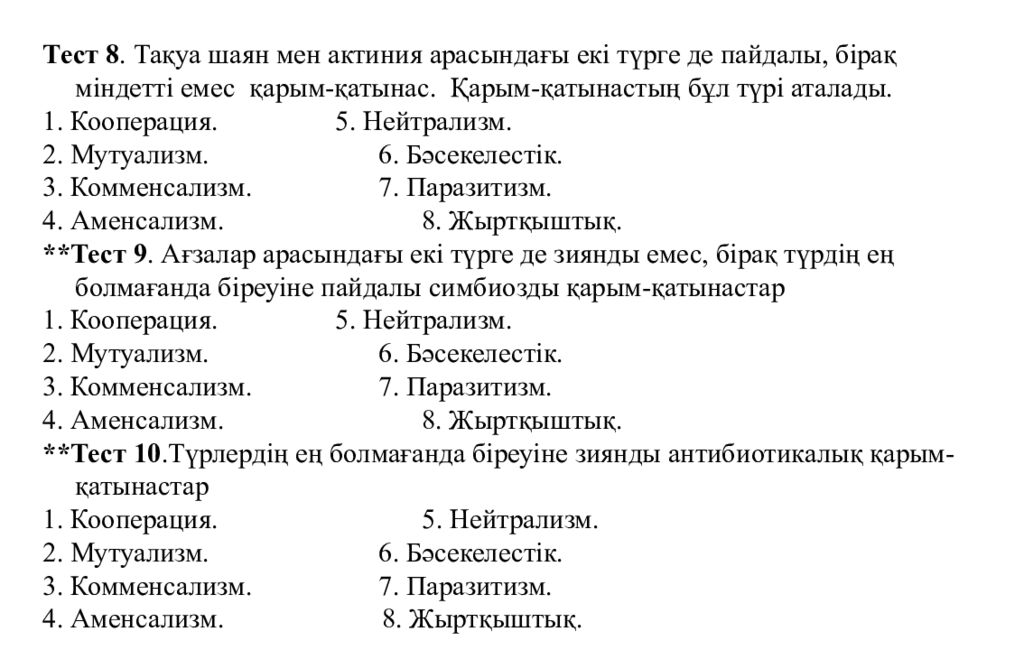 Тест 8. Тақуа шаян мен актиния арасындағы екі түрге де пайдалы, бірақ міндетті емес қарым-қатынас. Қарым-қатынастың бұл түрі аталады. 1. Кооперация. 5. Нейтрализм. 2. Мутуализм. 6. Бәсекелестік. 3. Комменсализм. 7. Паразитизм. 4. Аменсализм. 8. Жыртқыштық. **Тест 9. Ағзалар арасындағы екі түрге де зиянды емес, бірақ түрдің ең болмағанда біреуіне пайдалы симбиозды қарым-қатынастар 1. Кооперация. 5. Нейтрализм. 2. Мутуализм. 6. Бәсекелестік. 3. Комменсализм. 7. Паразитизм. 4. Аменсализм. 8. Жыртқыштық. **Тест 10.Түрлердің ең болмағанда біреуіне зиянды антибиотикалық қарым-қатынастар 1. Кооперация. 5. Нейтрализм. 2. Мутуализм. 6. Бәсекелестік. 3. Комменсализм. 7. Паразитизм. 4. Аменсализм. 8. Жыртқыштық.