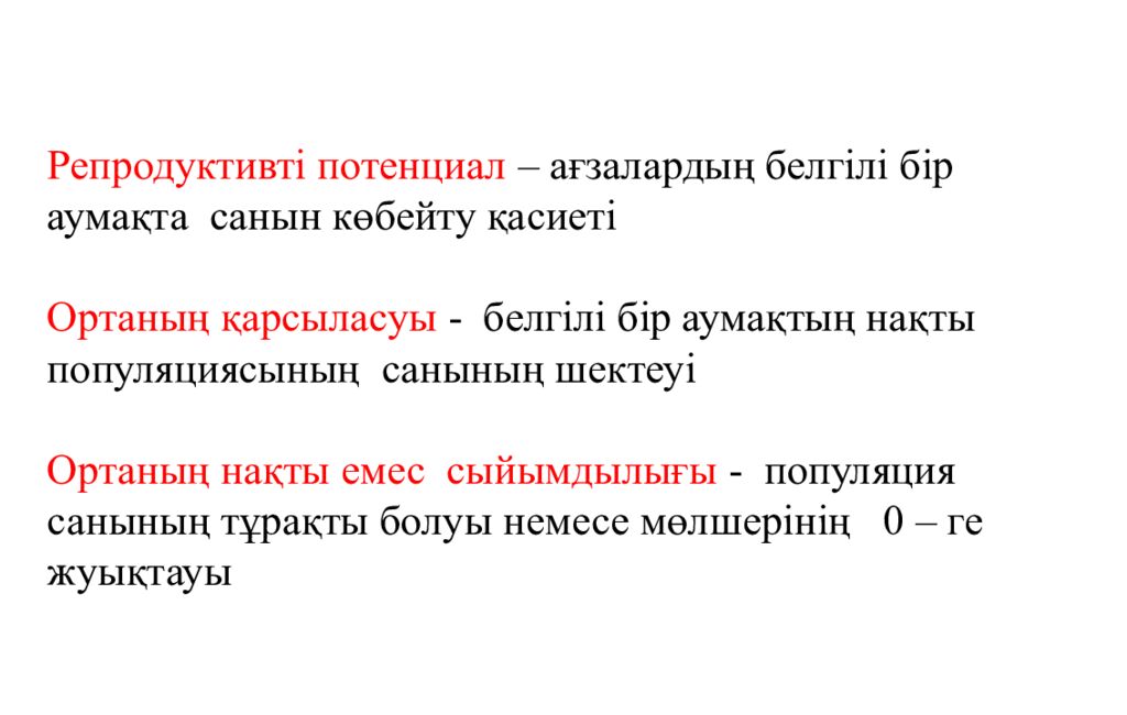Репродуктивті потенциал – ағзалардың белгілі бір аумақта санын көбейту қасиеті Ортаның қарсыласуы - белгілі бір аумақтың нақты популяциясының санының шектеуі Ортаның нақты емес сыйымдылығы - популяция санының тұрақты болуы немесе мөлшерінің 0 – ге жуықтауы