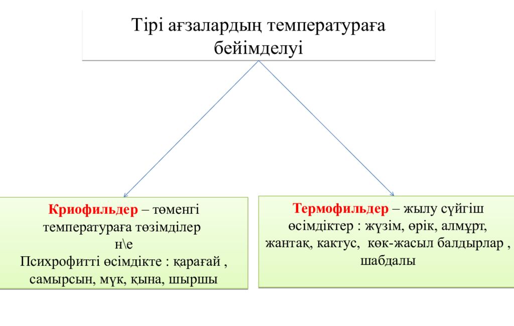 Тірі ағзалардың температураға бейімделуі Криофильдер – төменгі температураға төзімділер н\е Психрофитті өсімдікте : қарағай, самырсын, мүк, қына, шыршы Термофильдер – жылу сүйгіш өсімдіктер : жүзім, өрік, алмұрт, жантақ, кактус, көк-жасыл балдырлар, шабдалы