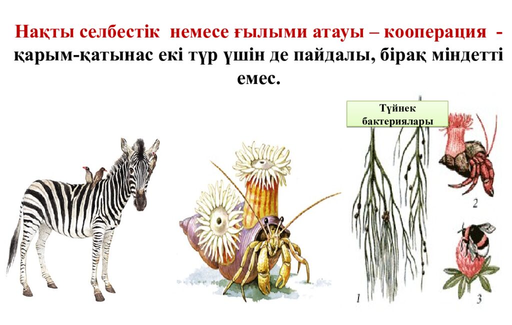 Нақты селбестік немесе ғылыми атауы – кооперация - қарым-қатынас екі түр үшін де пайдалы, бірақ міндетті емес. Түйнек бактериялары