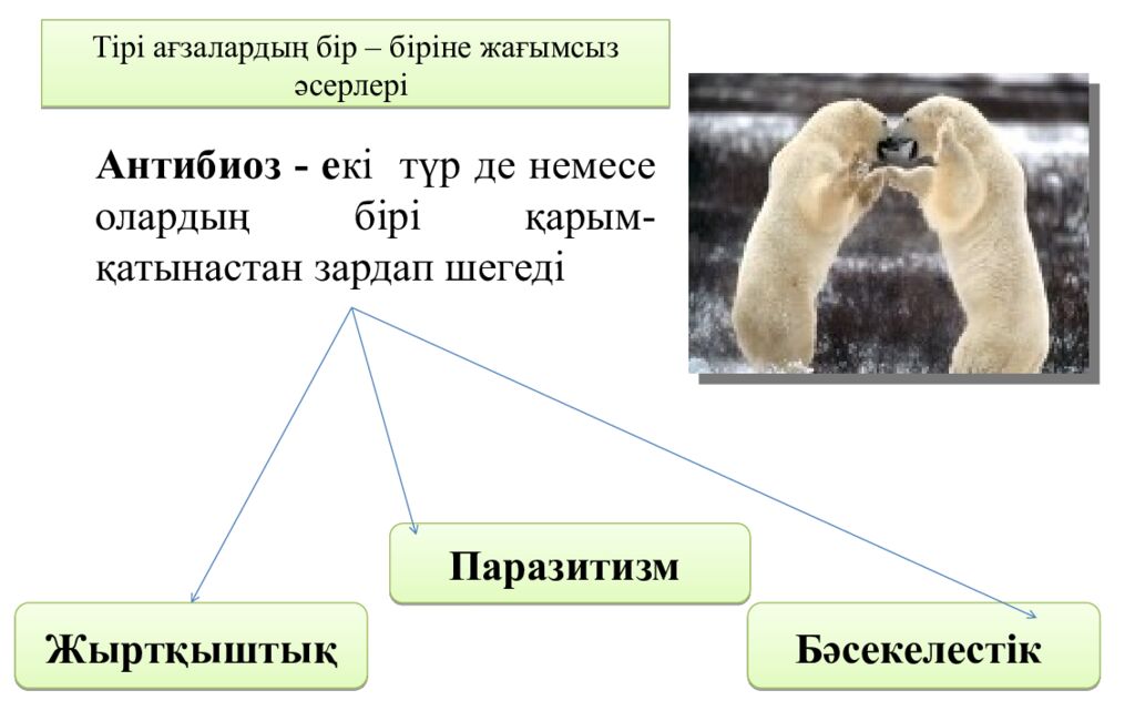 Антибиоз - е кі түр де немесе олардың бірі қарым-қатынастан зардап шегеді Жыртқыштық Паразитизм Бәсекелестік Тірі ағзалардың бір – біріне жағымсыз әсерлері