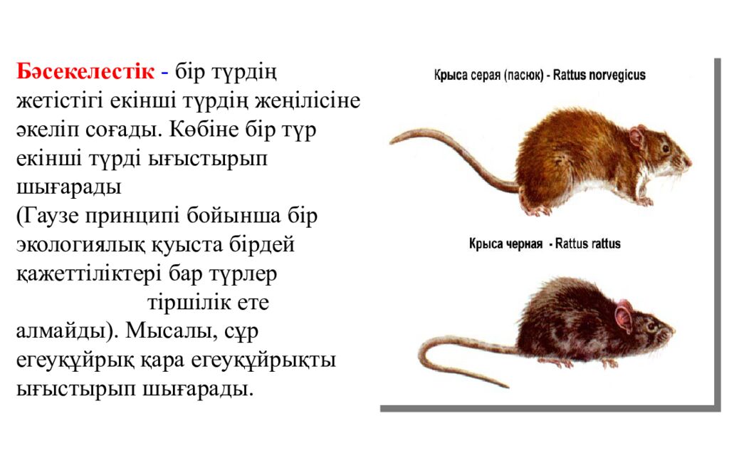 Бәсекелестік - б ір түрдің жетістігі екінші түрдің жеңілісіне әкеліп соғады. Көбіне бір түр екінші түрді ығыстырып шығарады ( Гаузе принципі бойынша бір экологиялық қуыста бірдей қажеттіліктері бар түрлер тіршілік ете алмайды ). Мысалы, сұр егеуқұйрық қара егеуқұйрықты ығыстырып шығарады.