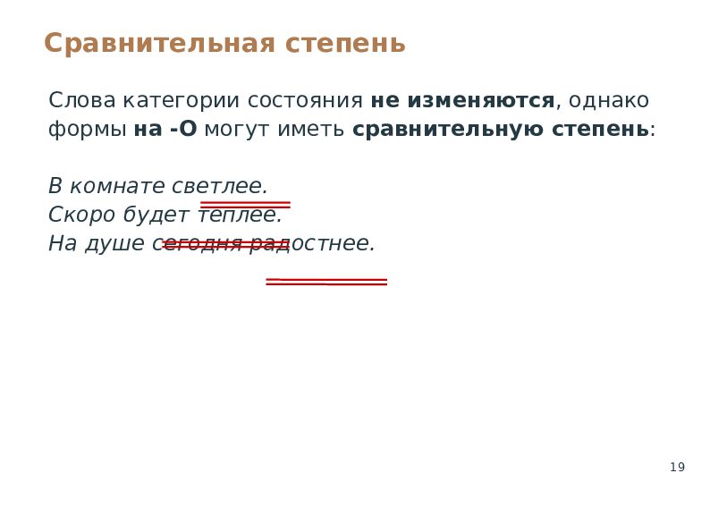 Слайд 19: Слова категории состояния не изменяются, однако формы на -О могут иметь сравнительную степень : В комнате светлее. Скоро будет теплее. На душе сегодня радостнее. Сравнительная степень