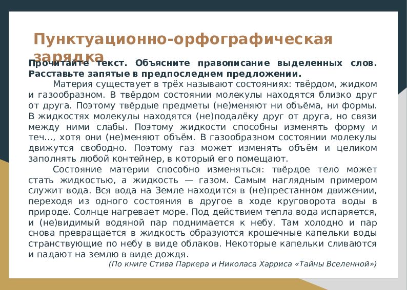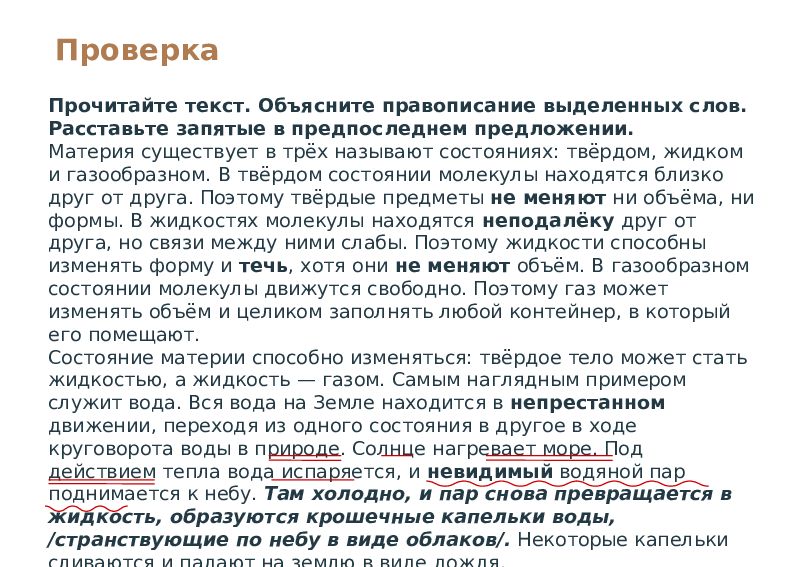 Пунктуационно-орфографическая зарядка Прочитайте текст. Объясните правописание выделенных слов. Расставьте запятые в предпоследнем предложении. Материя существует в трёх называют состояниях: твёрдом, жидком и газообразном. В твёрдом состоянии молекулы находятся близко друг от друга. Поэтому твёрдые предметы (не)меняют ни объёма, ни формы. В жидкостях молекулы находятся (не)подалёку друг от друга, но связи между ними слабы. Поэтому жидкости способны изменять форму и теч…, хотя они (не)меняют объём. В газообразном состоянии молекулы движутся свободно. Поэтому газ может изменять объём и целиком заполнять любой контейнер, в который его помещают. Состояние материи способно изменяться: твёрдое тело может стать жидкостью, а жидкость — газом. Самым наглядным примером служит вода. Вся вода на Земле находится в (не)престанном движении, переходя из одного состояния в другое в ходе круговорота воды в природе. Солнце нагревает море. Под действием тепла вода испаряется, и (не)видимый водяной пар поднимается к небу. Там холодно и пар снова превращается в жидкость образуются крошечные капельки воды странствующие по небу в виде облаков. Некоторые капельки сливаются и падают на землю в виде дождя. (По книге Стива Паркера и Николаса Харриса «Тайны Вселенной»)